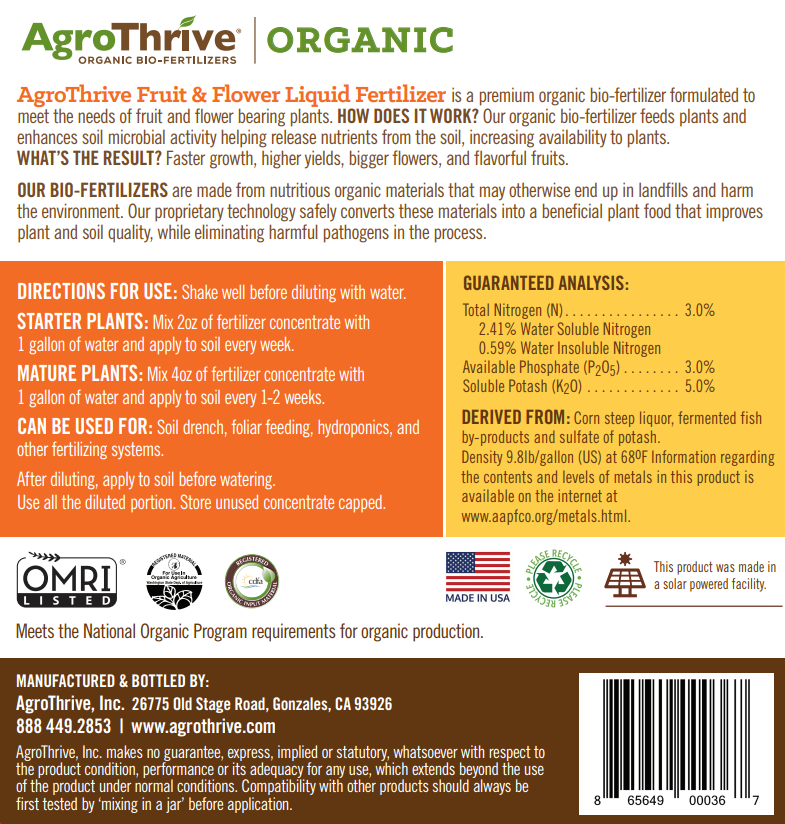 ✔ Organic liquid fertilizer formulated for vegetables, fruits, and flower-bearing plants; derived from corn steep liquor, fermented fish by-products, and sulfate of potash